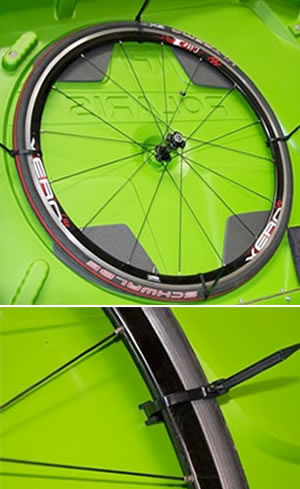 Please note that all Pods made after April 2011 feature a different wheel fitting mechanism to the original design. In all new Pods bike wheels are held in place via re-usable zip ties, rather than using quick releases. This new feature means that each wheel is attached at four points, rather than one.